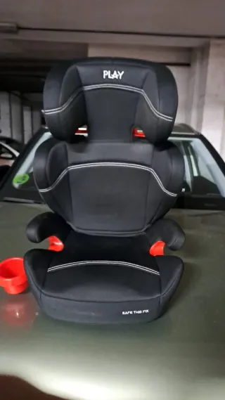 Silla de coche para niños del grupo 2 y 3, de la marca Play Safe Two. Diseñada para ofrecer comodidad y seguridad. Con muy poco uso, cómo se ve en fotos, esta impecable. - Tapicería en color negro. - Costuras blancas decorativas. - Incluye portavasos rojo.