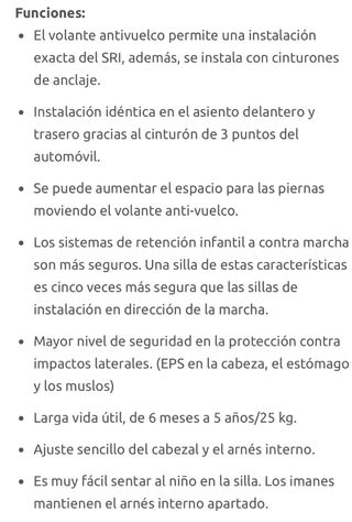 Nueva son 595 euros, la compramos por ser una de las más seguras. Perfecto estado, limpia, sin roces. Silla a contramarcha. Hasta 25 kg Protección contra impactos laterales cabeza y cuerpo (SIP) Interior con material que amortigua golpes (EPS) 3 posiciones de reclinado Muy cómoda Sistema de imanes en arnés super útil para ser fácil sentar al bebé Es una de las pocas que han pasado Plus Test de seguridad. Se aumenta el espacio para las piernas muy fácilmente