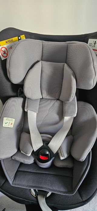 - Grupo de uso: 0+/1 (desde nacimiento hasta 18 kg, aprox. 4 años). - Orientación: Exclusivamente a contramarcha (rear-facing). - Puede instalarse con Isofix o con cinturón de 3 puntos del coche. - Incluye pata de apoyo y lower tethers (cintas de sujeción) para mayor estabilidad (se ven enrolladas en la foto). - Arnés: Arnés de 5 puntos ajustable en altura. - Reposacabezas: Regulable en altura con buen acolchado lateral. - Reductor: Incluye reductor para recién nacidos (aunque en la foto no aparece). Va sobre una base que se queda fija en el coche, y se puede poner y quitar fácilmente. Puede desenfudarse fácilmente para limpiarla