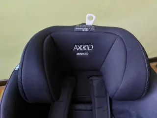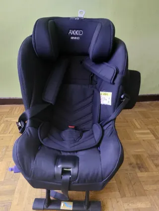 Silla de coche a contramarcha Axkid Minikid para grupos 1 y 2. Diseñada para ofrecer seguridad y comodidad para niños con un peso de 9 a 25 K. Segura, cómoda y espaciosa, cuenta con tecnología de reposacabezas y arnés auto-ajustable que actúan sincronizados tensando la misma cinta que tiene incorporada la silla. Incluye pata de apoyo, 2 low-tethers (correas que se ajustan al suelo del vehículo), protector ante impacto lateral y compatible con ISOFIX. Está en muy buen estado, no tiene roces y además regalo un protector para el asiento del coche. - Color negro. - Acolchado interior. - Arnés de seguridad de 5 puntos.