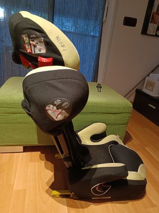 sillita de coche a contra marcha grupo 1/2 desde 9 kg hasta 25 kg se fija con el cinturón de seguridad y tiene pata de refuerzo 3 puntos de anclaje para la sujeción textil desengundable para lavar Tiene bastante uso, pero està en buenas condiciones funda de regalo