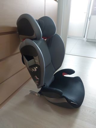 Vendo silla de coche Cybex X2-Fix en color gris. Está en muy buen estado, apenas se ha usado. Solo un agujero pequeño, adjunto foto en la tapiceria. - Válida para grupos 2/3. - Incluye protectores laterales para la cabeza. - Tapicería gris y negra.