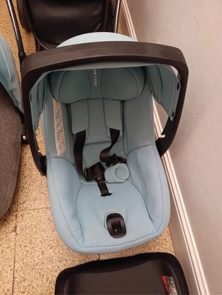 🔹 Incluye: 1. Silla de paseo Be Cool • Chasis con ruedas • Asiento con arnés de seguridad • Capota extensible • Cesta inferior para objetos 2. Capazo Be Cool • Ideal para recién nacidos • Interior acolchado • Capota incluida • Se acopla al chasis del cochecito 3. Portabebés / Grupo 0 Be Cool • Para uso en coche y sobre el chasis • Asa de transporte • Arnés de seguridad • Acolchados desmontables 4. Elevador infantil de coche – Marca Nania • Asiento elevador sin respaldo • Color negro • Para niños más mayores 🔹 Características generales: • Sistema modular (capazo, silla y portabebés intercambiables)
