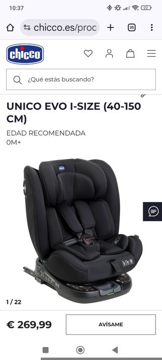 Silla de coche Chicco Unico-Evo, homologada i-Size para niños de 40-150 cm. Nueva a estrenar sin sacar del embalaje. La compré para el coche de mi madre pero como no tiene Isofix, no la puedo utilizar. - Homologación ECE R 129/04. - Diseño moderno y seguro. - Incluye instrucciones de uso.
