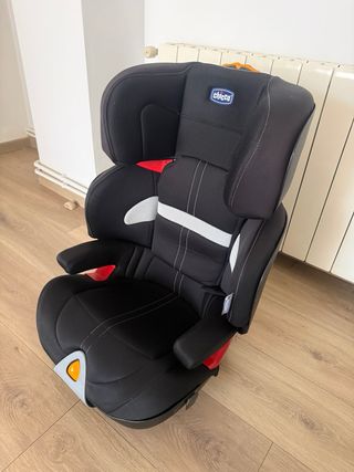 Silla de coche Chicco en color negro y gris, con detalles en rojo. Recien lavada. - Diseño ergonómico. Se adapta la inclinación, altura y anchura. - El asiento se puede separar. - Adaptable de 15 a 36kg. - Sistema ISOFIX. - Incluye portavasos.
