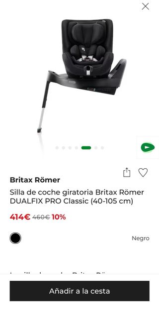 Vendo silla de coche Britax Römer Dualfix i-Size en muy buen estado. Es uno de los modelos más seguros y cómodos del mercado. Muy bien cuidada, limpia y sin accidentes. Características clave: Rotación 360º: Comodísima para sentar y abrochar al bebé desde la puerta, y permite ir a contramarcha o a favor de la marcha. Seguridad: Normativa i-Size y sistema ISOFIX con pata de apoyo. Comodidad: Varias posiciones de reclinado y cabezal ajustable.