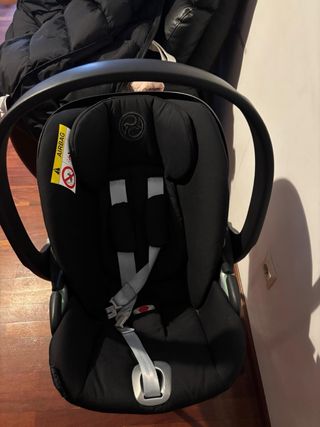Silla de coche Cybex en color negro con base isofix con pata. - Diseño acolchado des del nacimiento hasta los 13kg. Silla extraïble acoplable a estructura cochecito. - Sistema de arnés de seguridad ajustable con facilidad. - Incluye etiqueta de advertencia de airbag, reductor recien nacido e instrucciones de la silla y la base. Algunas marcas de uso. Precio total compra nuevo 750€