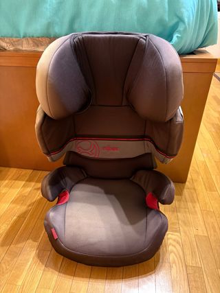 Silla de coche CYBEX en color marrón y gris con detalles en rojo. - Diseño ergonómico para mayor comodidad. - Reposacabezas ajustable. - Funda extraíble y lavable. NO TIENE ISOFIX Zonas descoloridas por el sol