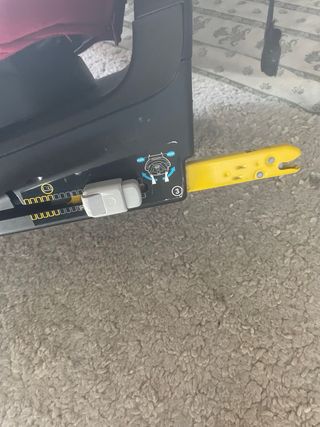 Silla giratoria 360º, fijación con isofix y pata de apoyo. Con reductor de recién nacido desde los 45-61 cm. En buen estado, marcas de uso en la zona de apoyo de los pies.