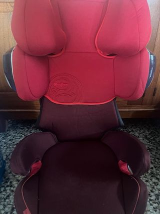 Silla de coche Cybex en color burdeos, adecuada para niños de 3 a 10 años. - Diseño ergonómico. - Reposacabezas ajustable. - Acolchado confortable. - Desmontable , se queda elevador - Sistema isofix