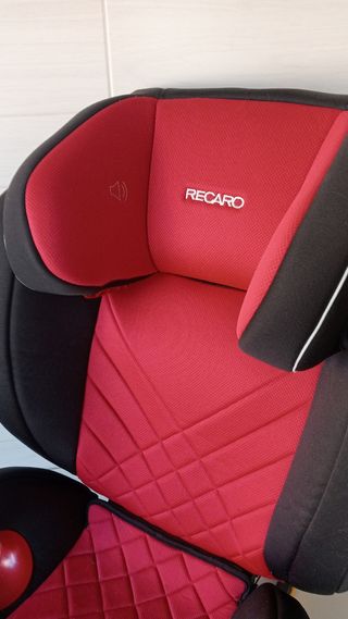 Silla de coche RECARO con un diseño moderno en color rojo y negro. Con anclaje isofix grupo 2 y 3. Sonido envolvente en el reposacabezas. En perfecto estado. - Detalle de logo RECARO. - Símbolo de altavoz en el lateral.