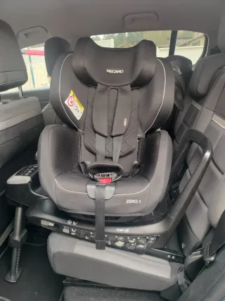 Silla infantil Recaro Zero.1 i-Size con giro 360 grados y anclaje Isofix. Uso: Desde el nacimiento (aprox. 40-45 cm) hasta unos 105 cm de altura o 4-4.5 años (generalmente hasta 18 kg). Sentido de marcha: Prioriza sentido contrario a la marcha (más seguro) hasta los 4 años aprox., pero permite girar a sentido de la marcha si es necesario. Seguridad: Cumple norma i-Size (R129), con buena protección lateral y materiales de calidad. Otros detalles: Tiene arnés de 5 puntos, tela transpirable y es conocida por su comodidad y durabilidad. Es un modelo premium (bastante caro cuando salió nuevo), enfocado en seguridad y facilidad de uso
