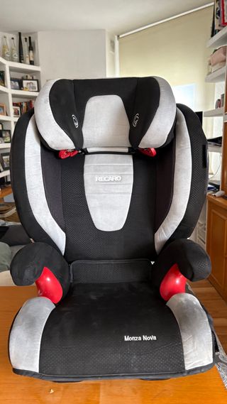 Silla de coche Recaro Monza Nova en color negro y detalles en rojo. Va desde 6 meses a 12 años. Con anclaje Isofix. Con altavoces integrados. Muy fiable. Bastante bien cuidada. - Diseño ergonómico. - Reposacabezas ajustable. - Protección lateral. - Funda extraíble y lavable.