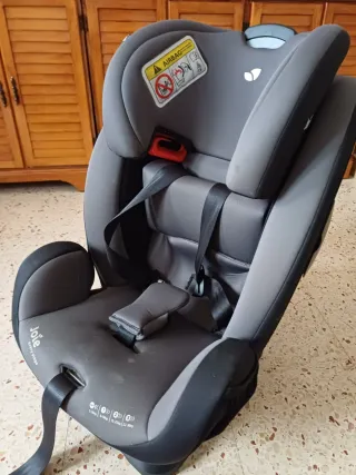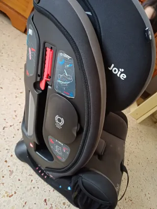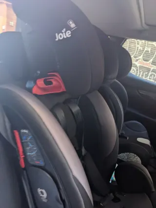 Silla Joie giratoria. Va desde los 0 años hasta los 4. Cuenta con adaptadores de cojín que se van quitando según crece el niño y funda de verano. Se gira para meter al bebe-niño de forma cómoda. Sirve para ir a contramarcha y a favor de la marcha. Cuenta con protección lateral contra impactos. Se puede reclinar. Muy cómoda para viajes largos.