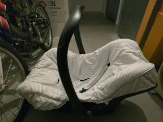 Silla de coche para bebé, también conocida como Maxi-Cosi. Diseñada para la seguridad y comodidad del más pequeño. - Funda acolchada con rayas grises y blancas. - Asa de transporte. - Sistema de arnés de seguridad.
