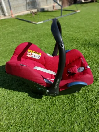 Silla de coche Maxi-Cosi en color rojo, con asa negra y detalles en azul. - Incluye arnés de seguridad de 3 puntos. - Funda acolchada para mayor comodidad. - Etiqueta de advertencia de airbag visible.