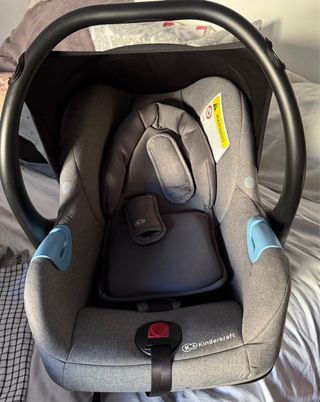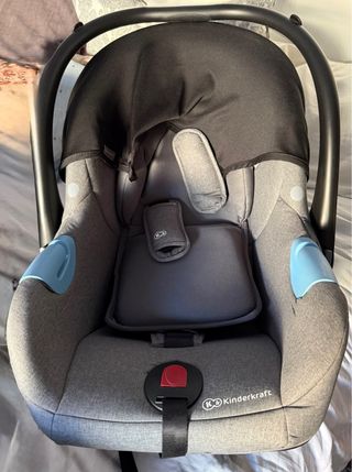 Silla de coche para bebé de la marca Kindercraft, en color gris y con detalles en azul. - Capota protectora. - Reductor para recién nacidos. - Arnés de seguridad de 3 puntos. - Asa de transporte. - Tejido acolchado.