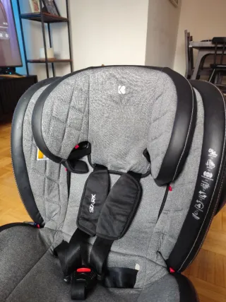 Silla de coche Kikkaboo Stark, diseñada para la seguridad y comodidad. - Tapicería de tela gris jaspeada. - Detalles en polipiel negra. - Sistema de arnés de 5 puntos. - Logo de Kikkaboo en la base. Falta el adaptador reductor de recién nacido que lo podría entregar en 2-3 semanas.