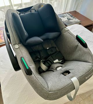 Silla de coche para bebé en color gris, marca Maxi-Cosi. Diseñada para la seguridad y comodidad del pequeño. - Tejido gris jaspeado. - Incluye reductores para recién nacidos. Hasta 13kg. - Arnés de seguridad de 5 puntos. - Palancas de liberación laterales en color verde.