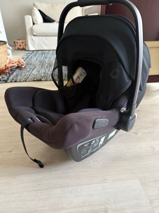 Silla de coche para bebé, grupo 0+, en buen estado. - Válida para niños desde el nacimiento hasta los 18 kg aproximadamente. - Sistema isofix para una instalación sencilla y segura. - Incluye reductor para recién nacidos. - Tapicería negra con detalles grises.