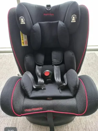 Silla de coche negra con detalles en rojo, marca Mondial Safe Osaka Premium. En perfecto estado. Grupo 0+/1/2/3 (0-36 kg). Con sistema de sujeción Isofix, auto theter y propio cinturón del vehículo. Rotación 360°, reclinable. - Diseño acolchado para mayor comodidad. - Incluye manual de instrucciones.