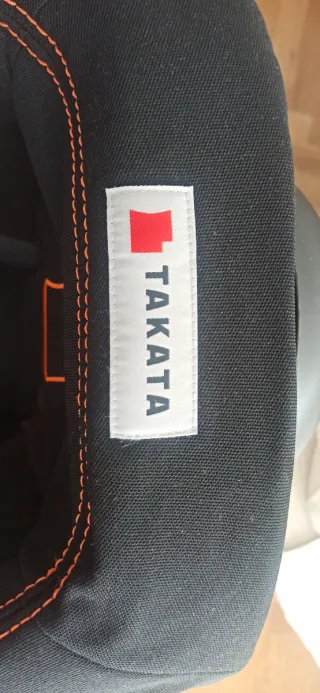 Silla de coche de la marca Takata, en color negro con detalles en naranja. - Diseño ergonómico. - Reposacabezas ajustable. - Acolchado confortable.