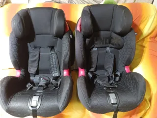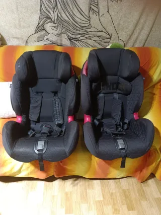 Se venden dos sillas de coche para bebé, ideales para transportar a los más pequeños con seguridad. - Color negro con detalles en rojo. - Sistema de arnés de 5 puntos. - Reposacabezas ajustable.