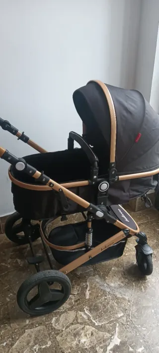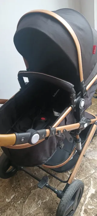 Carro de bebé en color negro con detalles en dorado. Un diseño elegante y funcional,con suspensiónes,usado solo dos meses . Muy ligero,fácil de doblar para llevarla en el maletero, también tiene silla de coche, es 3 en 1 . - Estructura resistente. - Capazo espacioso. - Ruedas todoterreno.