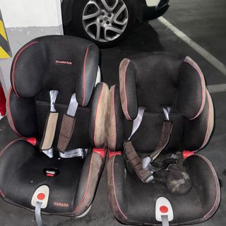 Dos sillas de coche para niños, ambas con sistema Isofix para una instalación segura y sencilla. - Una silla es de color marrón con detalles en gris y blanco. - La otra silla es de color negro con ribetes rojos. - Ambas sillas cuentan con arnés de seguridad de 5 puntos. La silla gris 30€ y la negra 30€ las dos sillas por 60€.