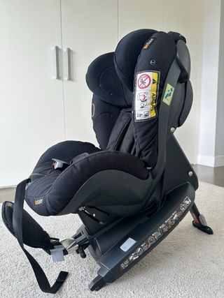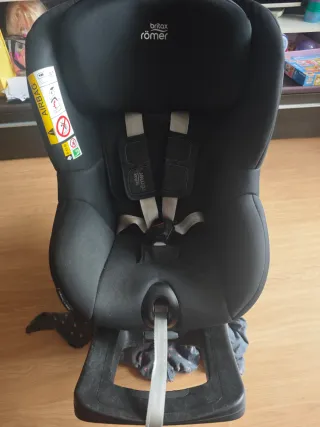 Silla de coche Britax Römer Dualfix I-size en color negro. Diseñada para la seguridad y comodidad del pequeño. Hasta 18 kg. Rotatoria para mayor comodidad. En buen estado, no ha recibido ningún golpe. Utilizada siempre con funda. - Arnés de seguridad de 5 puntos. - Funda acolchada. - Indicaciones de seguridad en la etiqueta lateral. Precio a convenir