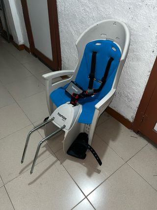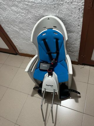 Silla portabebés Hamax Smiley en buen estado. Diseñada para la seguridad y comodidad del niño. - Color azul y blanco. - Cinturón de seguridad de 5 puntos. - Soporte metálico para el montaje en la bicicleta.