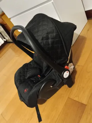 Silla de coche para bebé, apta para un peso de 0 a 18 kg. El diseño es en color negro con detalles en gris. - Acolchado interior. - Arnés de seguridad. - Funda extraíble (para adaptar a bebés recién nacidos) -Utilizado únicamente una vez