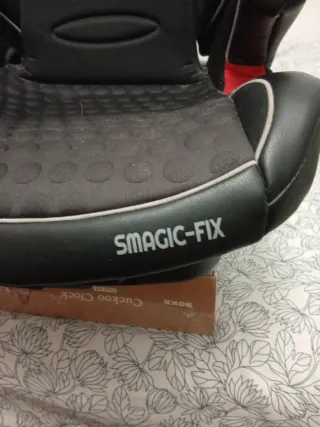 Silla de coche SMAGIC-FIX en color negro. Diseñada para la seguridad y comodidad. - Diseño acolchado. - Detalles en blanco y rojo. - Etiqueta SMAGIC-FIX visible.