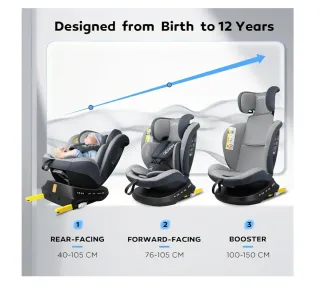 Reecle I-Size Silla de Coche Giratoria 360 con ISOFIX, 40-150cm (0~36kg), Aprox. 0-12 años (Gris) Silla de coche para bebé, con un diseño moderno y funcional. - Tapicería en tonos grises. - Sistema de arnés de seguridad. - Base giratoria para facilitar el acceso.