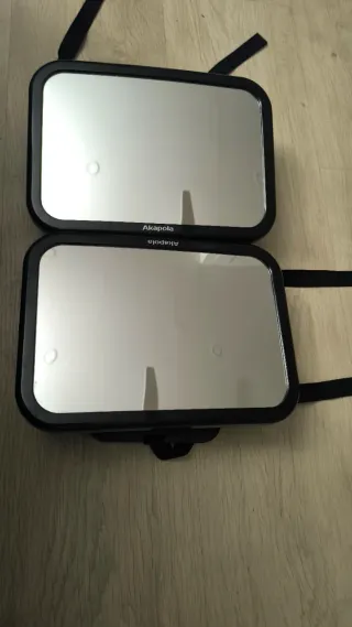Espejo para sillita de coche de la marca Akapola. Permite ver al bebé mientras conduces. - Marco negro. - Correas de sujeción incluidas. Se vende los dos juntos