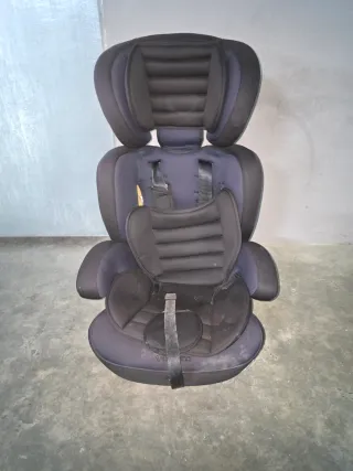 Silla de coche en color negro, con detalles en gris y cinturones de seguridad. Tiene ambos corchos rotos. - Tejido acolchado. - Reposacabezas ajustable. - Sistema de arnés de 5 puntos.
