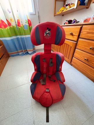 Silla de coche infantil con diseño de Mickey Mouse. Es regulable para adaptarse al crecimiento del niño. - Color rojo y azul. - Incluye arnés de seguridad. - Dibujo de Mickey Mouse en el reposacabezas.