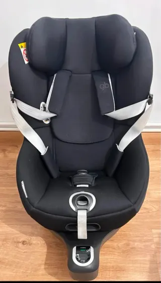 Silla de coche negra con detalles en gris y el logo de la marca gb. - Sistema de arnés de 5 puntos. - Reposacabezas ajustable. - Base con indicadores de instalación.