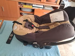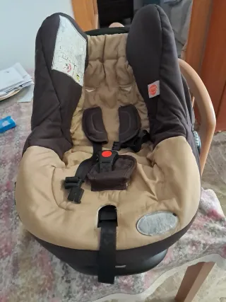 Silla de coche para bebé, diseñada para los primeros meses de vida. - Color marrón y beige. - Incluye arnés de seguridad de 5 puntos. - Funda acolchada para mayor comodidad.
