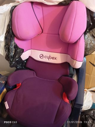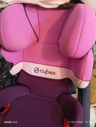 Silla de coche Cybex en color rosa y morado. - Diseño ergonómico. - Refuerzos laterales. - Marca: Cybex. NO HA TENIDO ACCIDENTES, practicamente NUEVA, apenas se ha usado ya que la teniamos como de reserva. Adaptable hasta la altura máxima obligatoria para llevar sillita en el coche.