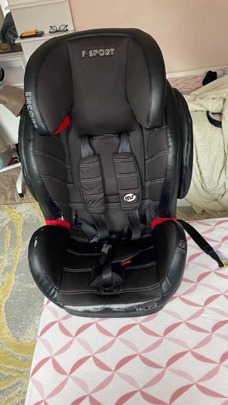 Silla de coche negra con detalles en rojo y blanco. - Marca F-Sport. - Modelo ENCORE. - Sistema de arnés de 5 puntos. - Funda acolchada.