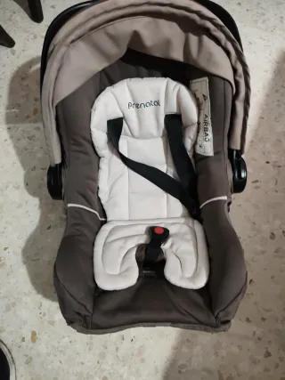Cuco para silla de bebé de la marca Prenatal. - Color marrón y beige. - Incluye cinturón de seguridad. - Etiqueta AIRBAG visible. De 0 a 13 kg