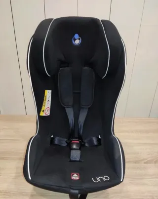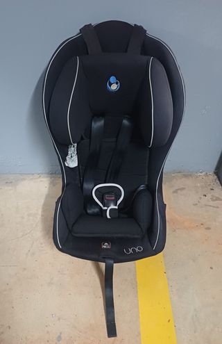 Silla de coche negra con detalles en blanco y un logo azul en la parte superior. Incluye un espejo. Silla para coche + espejo colgador Silla que no tiene isofix Silla a contra marcha Se agarra bien con arneces que vienen incluidos. La silla tambien viene con una pata que es regulable Cogin acolchado Todo se puede regular Forro lavable - Marca: UNO