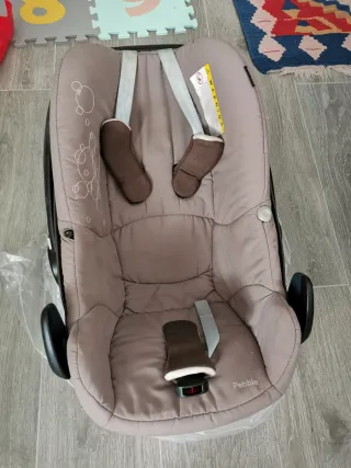 Silla de coche para bebé marca Maxi-Cosi, modelo Pebble. Color beige con detalles en marrón. - Diseño acolchado para mayor comodidad. - Incluye reductores para recién nacidos. - Sistema de arnés de seguridad. - Funda extraíble para lavado.
