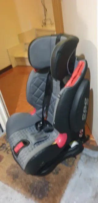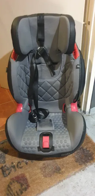 Silla de coche en color gris y negro con detalles en rojo. - Sistema de anclaje Isofix. - Diseño acolchado para mayor comodidad. - Cinturón de seguridad de 5 puntos.