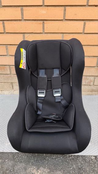 Silla de coche negra para niños pequeños. Cuenta con un arnés de seguridad de 5 puntos. - Color: Negro. - Arnés de 5 puntos. - Etiqueta de advertencia de airbag.