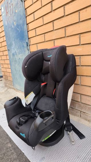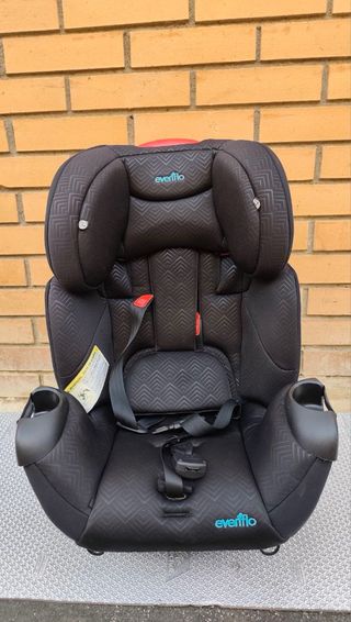 Silla de coche Evenflo en color negro con un diseño moderno. - Tejido con patrón geométrico. - Reposacabezas ajustable. - Portavasos integrados.