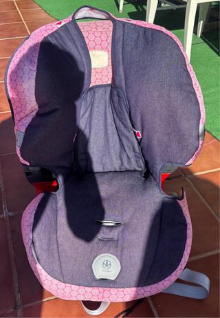 Silla de coche para niña en color rosa, en excelente estado. - Diseño con costuras rosas. - Detalle de triángulo rosa bordado en el reposacabezas. - Incluye etiqueta de instrucciones del fabricante.