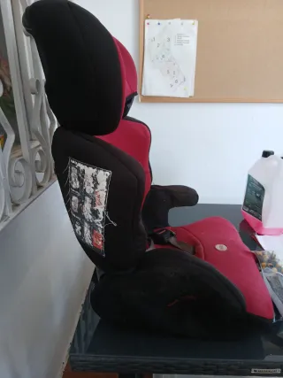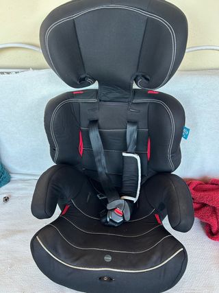 Silla de coche para niños, adaptable a diferentes etapas de crecimiento. - Diseñada para los grupos de peso I, II y III. - Tapicería negra con detalles en rojo y costuras blancas. - Sistema de arnés de seguridad de 5 puntos. cuando crece se pone el cinturón de seguridad