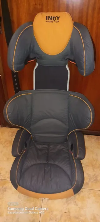 Silla de coche con diseño deportivo. - Tapicería acolchada en gris y naranja. - Reposacabezas con logo INDY RACING TEAM.